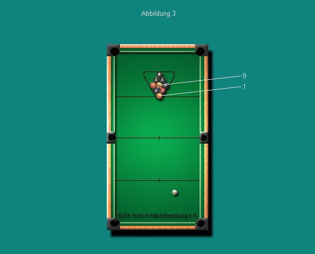Die allgemeinen Pocket-Billard-Regeln finden grundsätzlich Anwendung, es sei denn, daß diesen hier ausdrücklich widersprochen wird. 5.1 Ziel des Spiels (1) 9-Ball wird mit neun numerierten Kugeln (Nr. 1-9) und der Weißen gespielt. Bei jedem Stoß muß als erste Kugel diejenige mit der niedrigsten Zahl angespielt werden, aber die Kugeln müssen nicht in der Reihenfolge versenkt werden. (2) Versenkt ein Spieler eine Kugel korrekt, dann bleibt er solange am Tisch, bis er eine Kugel verschießt, ein Foul begeht oder die "9" versenkt und das Spiel damit gewinnt. (3) Nach einem Fehlstoß muß der dann aufnahmeberechtigte Gegner von der Position weiterspielen, an der die Weiße liegenbleibt. Nach einem Foul hat der Gegner freie Lageverbesserung auf dem ganzen Tisch. (4) Es muß nichts angesagt werden. (5) Eine Partie ist dann beendet, wenn ein Spieler die nötige Anzahl Spiele gewonnen hat. 5.2 Aufbau der Kugeln Die farbigen Kugeln werden diamantförmig aufgebaut, wobei die "1" an der Spitze der Kugeln auf dem Fußpunkt und die "9" in deren Mitte liegt. Alle Kugeln sollen so nah wie möglich aneinander liegen. Das Spiel beginnt mit Lageverbesserung der Weißen aus dem Kopffeld. |